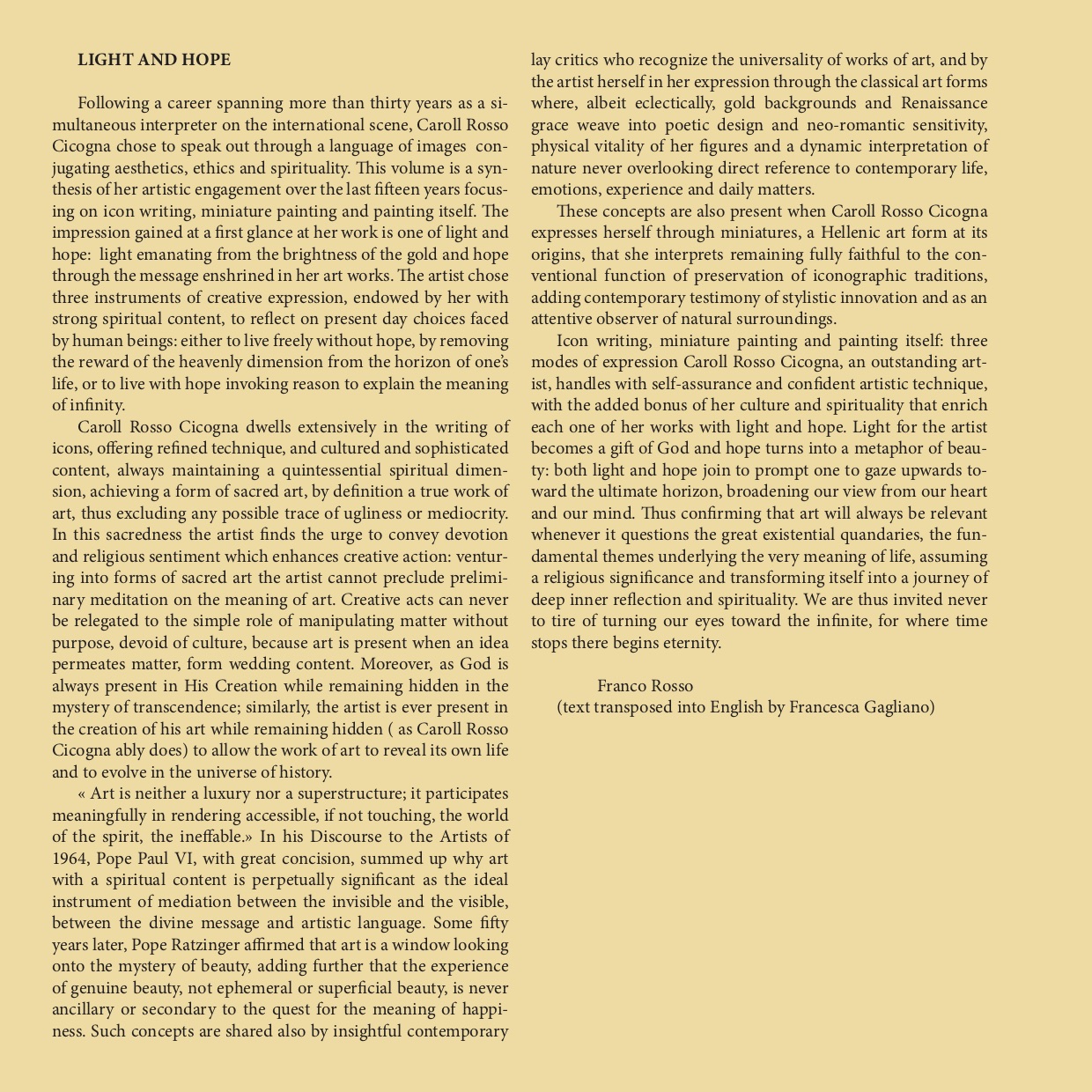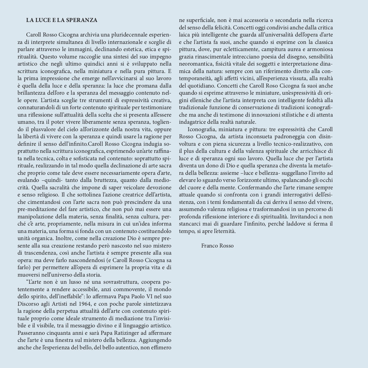 « L'art n'est ni un luxe ni une suprastructure, mais il permet de rendre accessible de façon puissante, voire émouvante, le monde de l'esprit, de l'ineffable. » : Sa Sainteté le pape Paul VI l'affirmait déjà dans son Discours aux Artistes en 1964, et en ces termes sobres, il synthétisait la notion de l'actualité permanente de l'art à contenu spirituel comme instrument idéal de médiation entre l'invisible et le visible, entre le message divin et le langage artistique. Cinquante ans plus tard, Sa Sainteté le pape Benoît XVI affirmera que l'art est une fenêtre sur le mystère de la beauté, ajoutant que l'expérience de la beauté, de la beauté authentique et non de la beauté éphémère et superficielle, n'est jamais accessoire ou secondaire dans la recherche de la félicité. De tels concepts sont également partagés par une certaine critique laïque contemporaine qui, avec intelligence, cherche à valoriser l'universalité de l'oeuvre d'art. Ces mêmes concepts, l'artiste les fait siens quand il s'exprime par les formes de l'art classique où se croisent, sans exclusive, les fonds d'or et la grâce harmonieuse d'une scène de la Renaissance, la poésie d'un dessin et la sensibilité néoromantique, la vitalité physique des sujets et l'interprétation dynamique de la nature, sans jamais oublier de se référer à son propre vécu et à son incontournable quotidien. Ces concepts, Caroll Rosso Cicogna les adopte également quand elle s'exprime à travers les enluminures, mode d'expression d'origine hellénique que l'artiste interprète en fidèle gardienne du rôle tra- ditionnel des traditions iconographiques, mais aussi en témoin actuel des innovations stylistiques et en exploratrice attentive de la réalité naturelle.