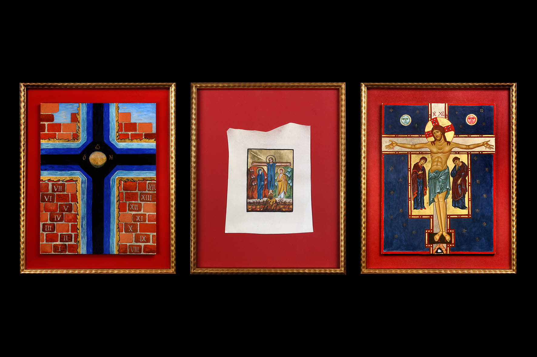 Le triptyque qui se compose d'une icône et d'une enluminure de facture traditionnelle et d'une miniature d'inspiration contemporaine a été réalisé avec la technique ancienne à la détrempe, la dorure à la feuille et l'application de lavis successifs utilisant des pigments historiques.